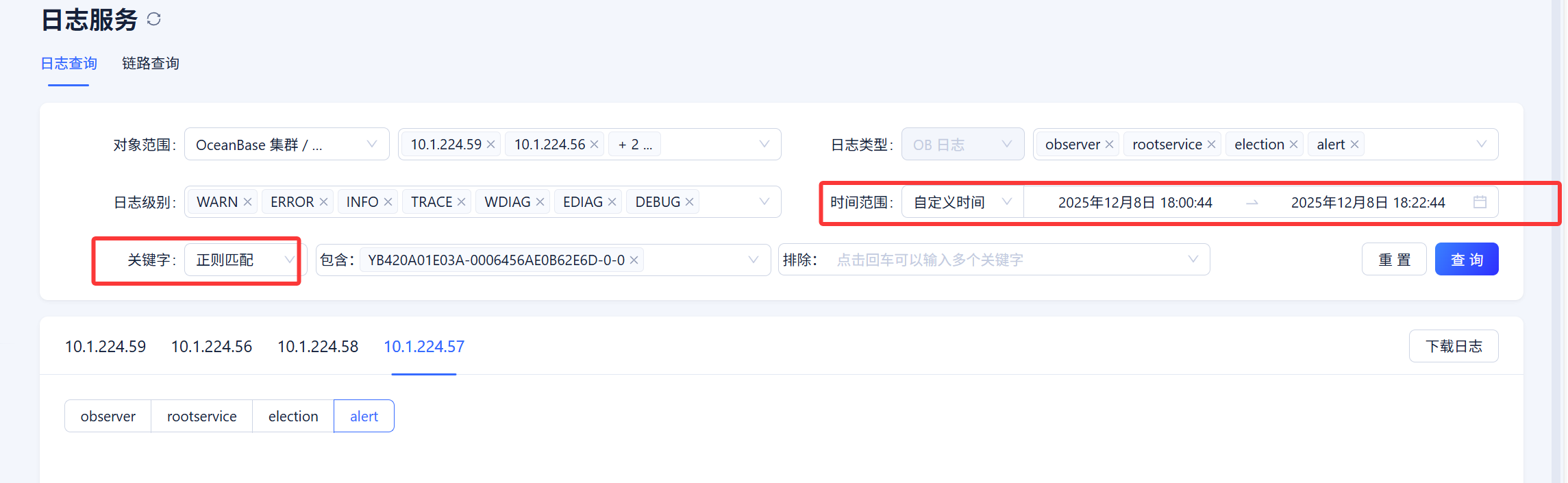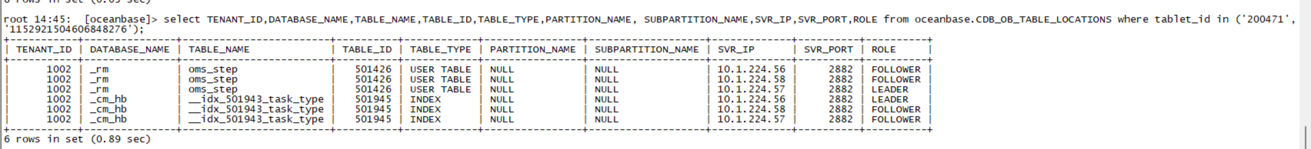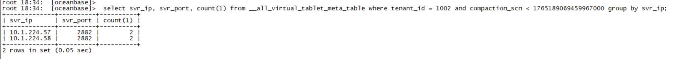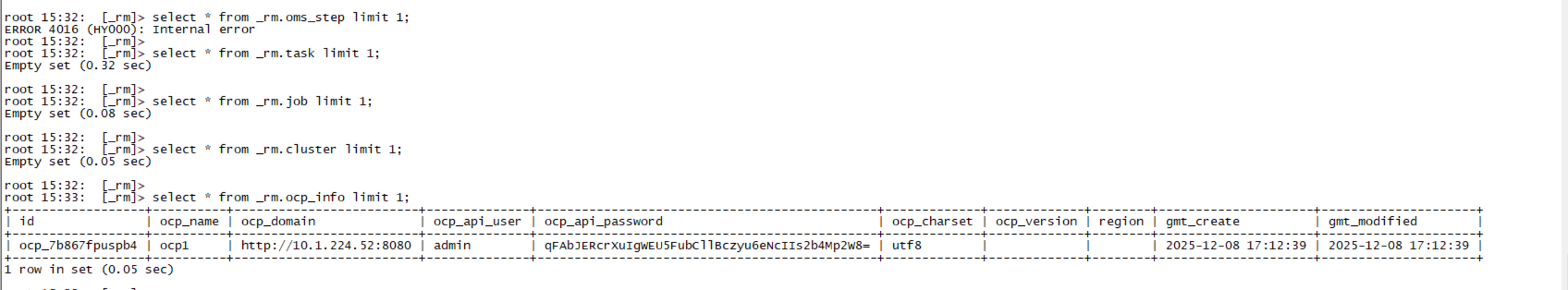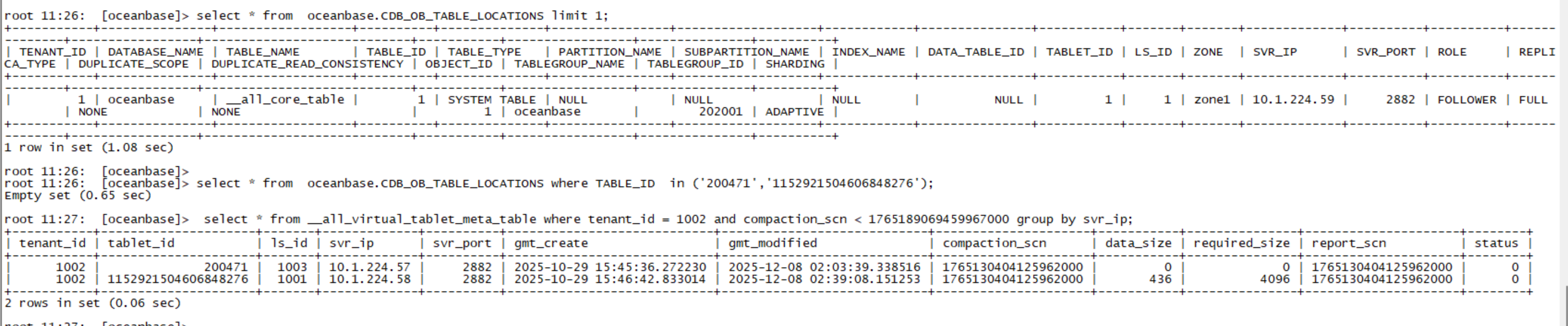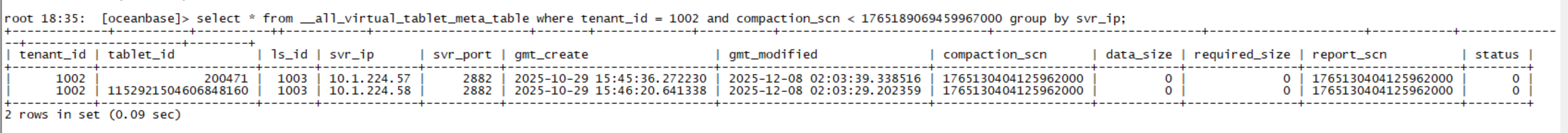 [2025-12-09 15:01:27.435162] INFO [SQL.EXE] end_stmt (ob_sql_trans_control.cpp:1532) [6845][T1002_L0_G0][T1002][YB420A01E03A-0006456AE1380FCF-0-0] [lt=13] end stmt(ret=0, tx_id=0, plain_select=true, stmt_type=1, savepoint=0, tx_desc={this:0x7f12e1764ae0, tx_id:{txid:0}, state:1, addr:“10.1.224.57:2882”, tenant_id:1002, session_id:3222229587, assoc_session_id:3222229587, client_sid:3221767929, xid:NULL, xa_mode:"", xa_start_addr:“0.0.0.0:0”, access_mode:-1, tx_consistency_type:0, isolation:1, snapshot_version:{val:18446744073709551615, v:3}, snapshot_scn:0, active_scn:0, op_sn:1, alloc_ts:1765263687430641, active_ts:-1, commit_ts:-1, finish_ts:-1, timeout_us:-1, lock_timeout_us:-1, expire_ts:9223372036854775807, coord_id:{id:-1}, parts:[], exec_info_reap_ts:0, commit_version:{val:18446744073709551615, v:3}, commit_times:0, commit_cb:null, cluster_id:-1, cluster_version:17180067075, seq_base:1765263687427534, flags_.SHADOW:false, flags_.INTERRUPTED:false, flags_.BLOCK:false, flags_.REPLICA:false, conflict_txs:[], abort_cause:0, commit_expire_ts:0, commit_task_.is_registered():false, modified_tables:[], last_rc_snapshot_version:{val:1765263687291568000, v:0}, ref:1}, trans_result={incomplete:false, parts:[], touched_ls_list:[], conflict_txs:[]}, rollback=true, need_rollback=true, session={this:0x7f13a66a9398, id:3222229587, client_sid:3221767929, deser:true, tenant:"", tenant_id:1002, effective_tenant:"", effective_tenant_id:1002, database:"_rm", user:“root@%”, consistency_level:3, session_state:2, autocommit:true, tx:0x7f12e1764ae0}, exec_ctx.get_errcode()=0)