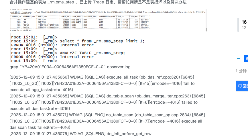 就是在leader是在57上 捞一下trace_id=YB420A01E03A-0006456AE1380FCF-0-0的observer.log日志信息 时间节点和截图的日志时间对应上 主要想看看oms_step表在leader节点的日志信息