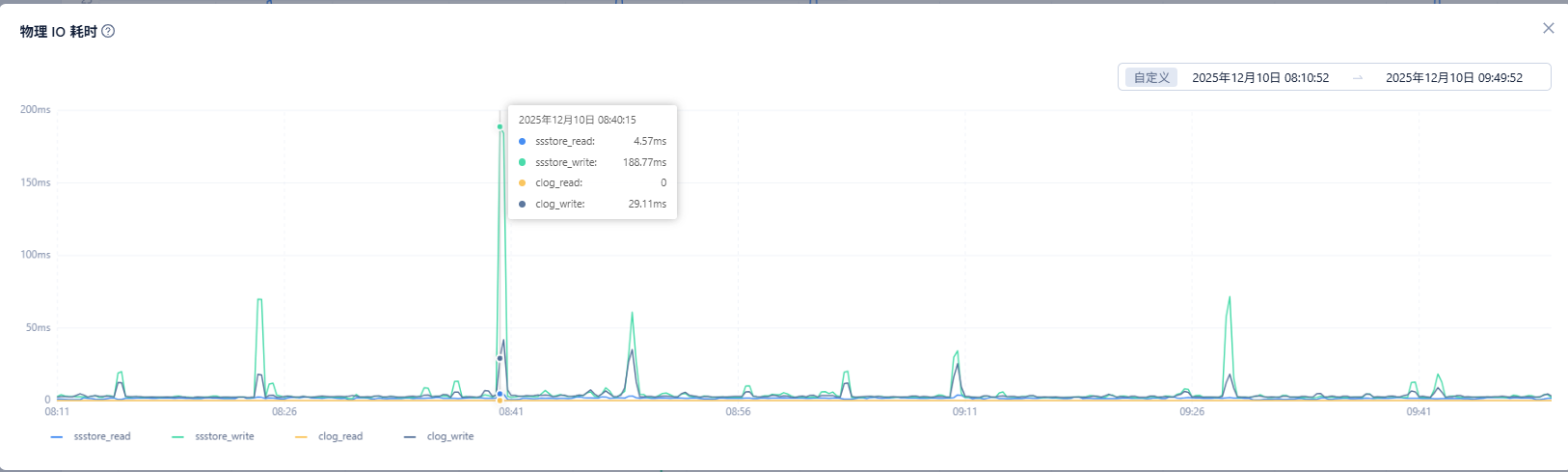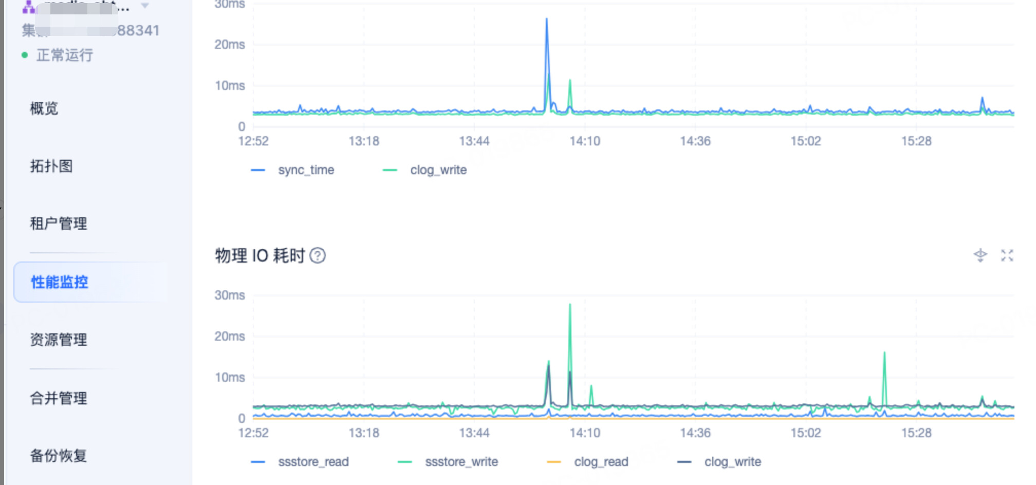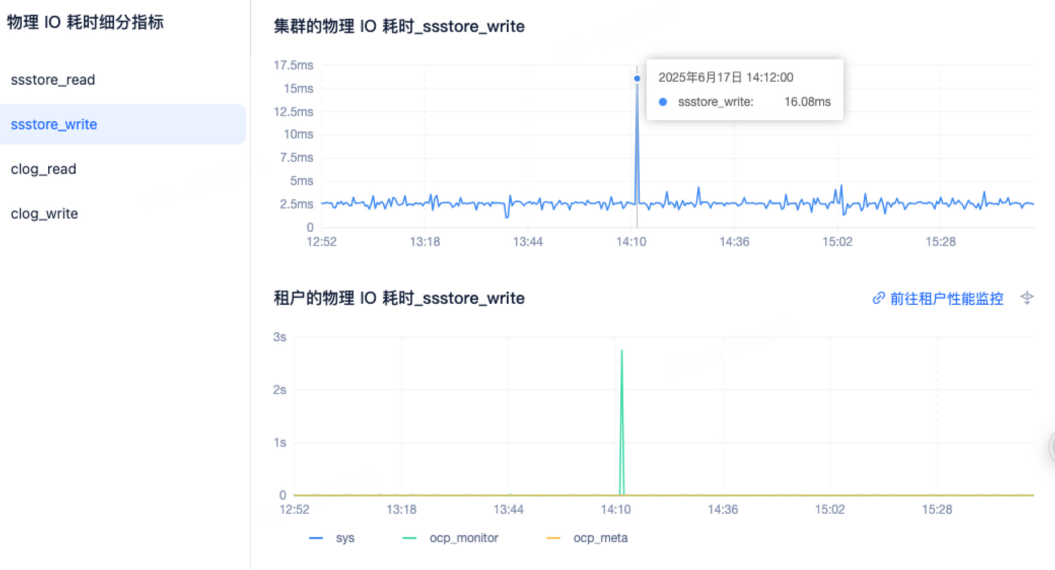 尖刺的物理IO耗时较高了,建议使用性能更好的磁盘 同时clog和data分开部署,这个告警大概会导致数据库hang住几秒 OCP大概会有卡顿,如果可以接受 可以忽略这个告警