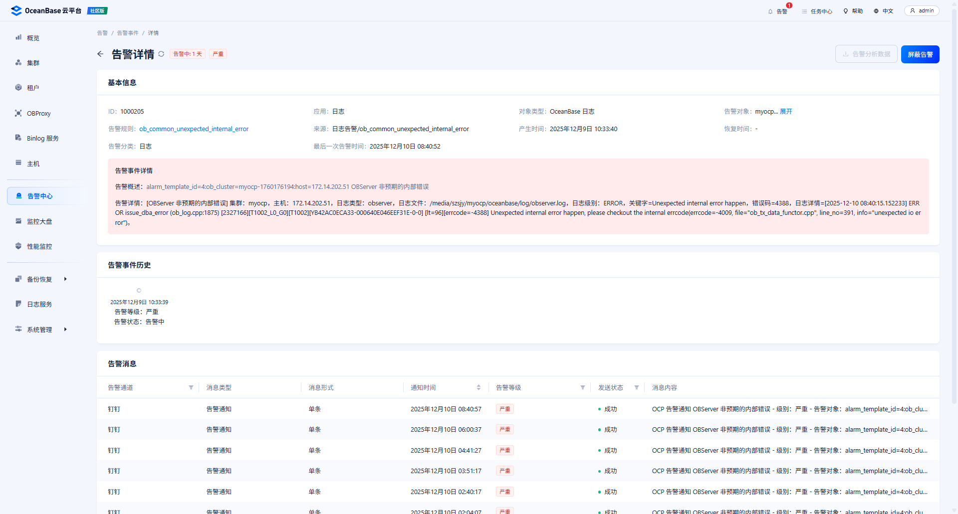 【问题描述】[OBServer 非预期的内部错误] 集群:myocp,主机:172.14.202.51,日志类型:observer,日志文件:/media/szsjy/myocp/oceanbase/log/observer.log,日志级别:ERROR,关键字=Unexpected internal error happen,错误码=4388,日志详情=[2025-12-10 08:40:15.152233] ERROR issue_dba_error (ob_log.cpp:1875) [2327166][T1002_L0_G0][T1002][YB42AC0ECA33-000640E046EEF31E-0-0] [lt=96][errcode=-4388] Unexpected internal error happen, please checkout the internal errcode(errcode=-4009, file=“ob_tx_data_functor.cpp”, line_no=391, info=“unexpected io error”)。