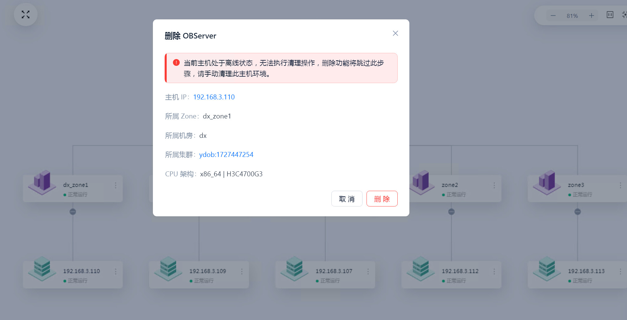 这是集群的拓扑图,上面是显示的110这台是正常运行的,我不知道是什么原因,但是这台机子所在的物理机磁盘都已经损坏了,所以已经没有这台机子了