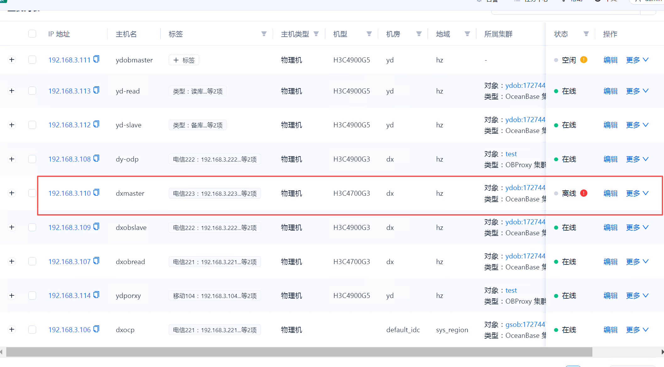 通过OCP的这个主机列表也能发现这个110这台主机是离线的状态