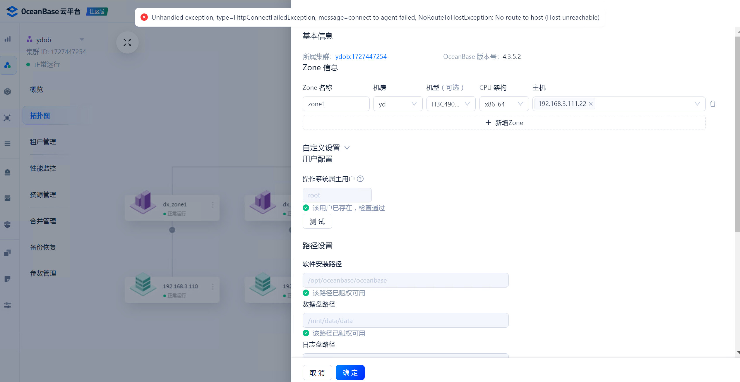 【问题描述】主机添加是成功了,然后我在集群里添加ZONE的时候报错提示Unhandled exception, type=HttpConnectFailedException, message=connect to agent failed, NoRouteToHostException: No route to host (Host unreachable)