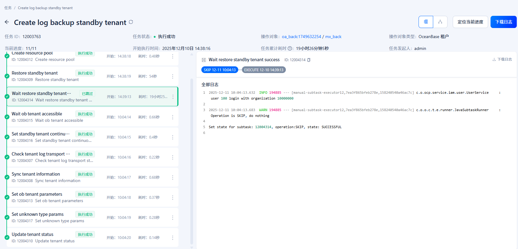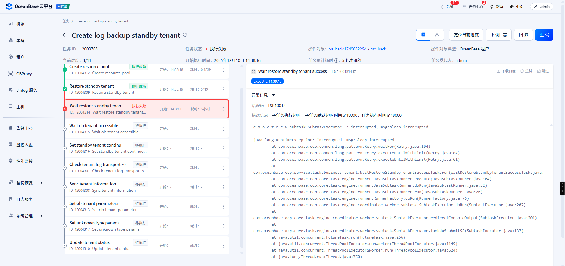 【问题描述】新建备租户时Wait restore standby tenant success环节提示TSK10012 子任务执行超时