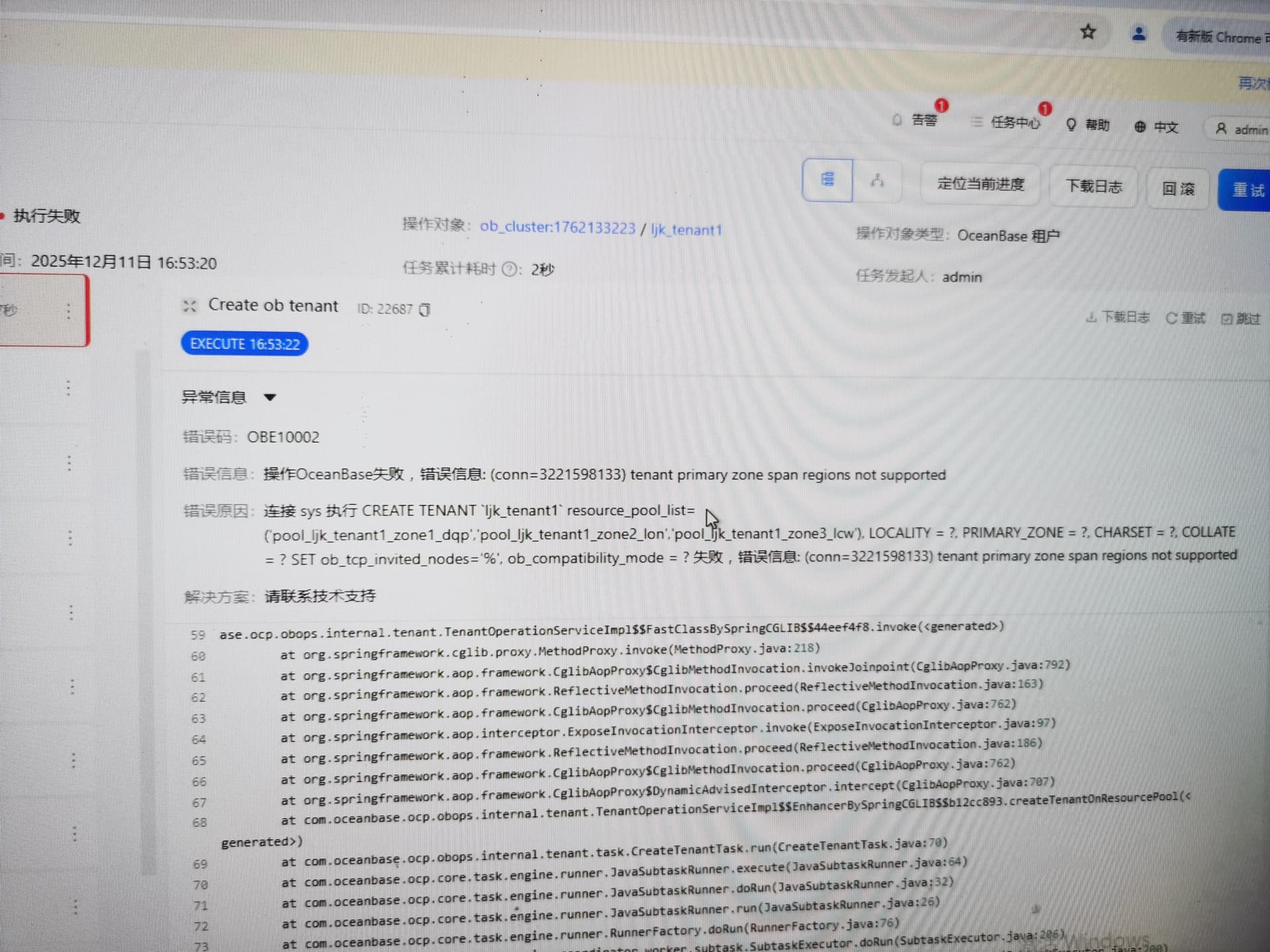 二、 你为租户设置的 primary_zone 跨了多个 Region,而当前部署不允许租户的主可用区跨 Region。
