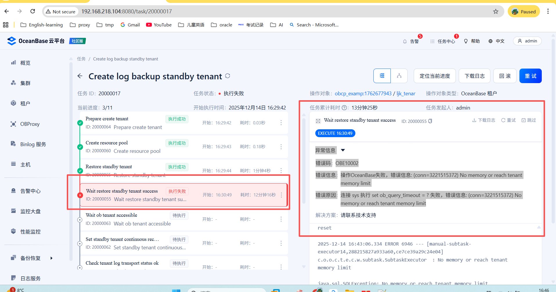 连接 sys 执行 set ob_query_timeout = ? 失败,错误信息: (conn=3221515372) No memory or reach tenant memory limit