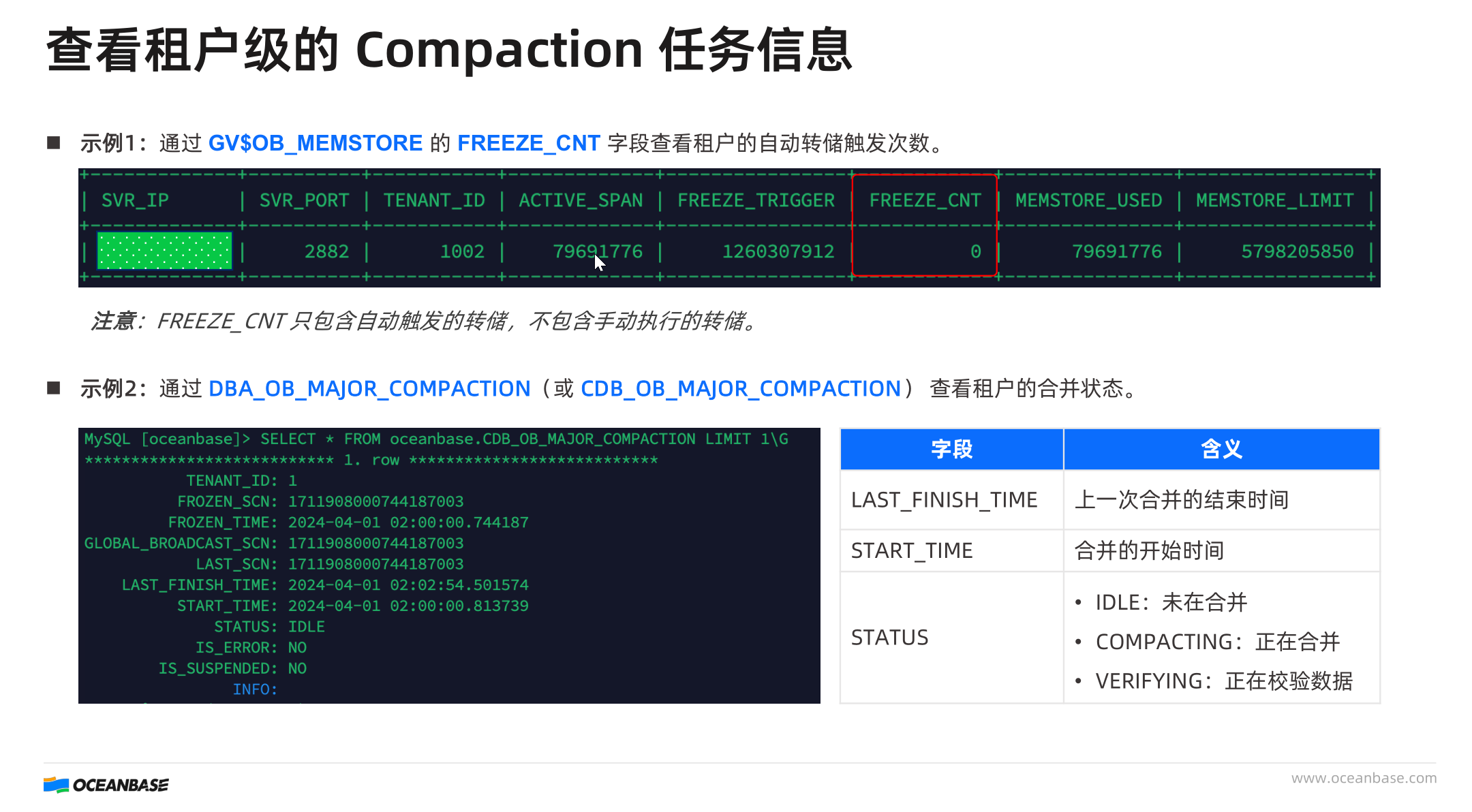 在视图GV$OB_MEMSTORE中,FREEZE_CNT 字段查看租户的自动转储触发次数。