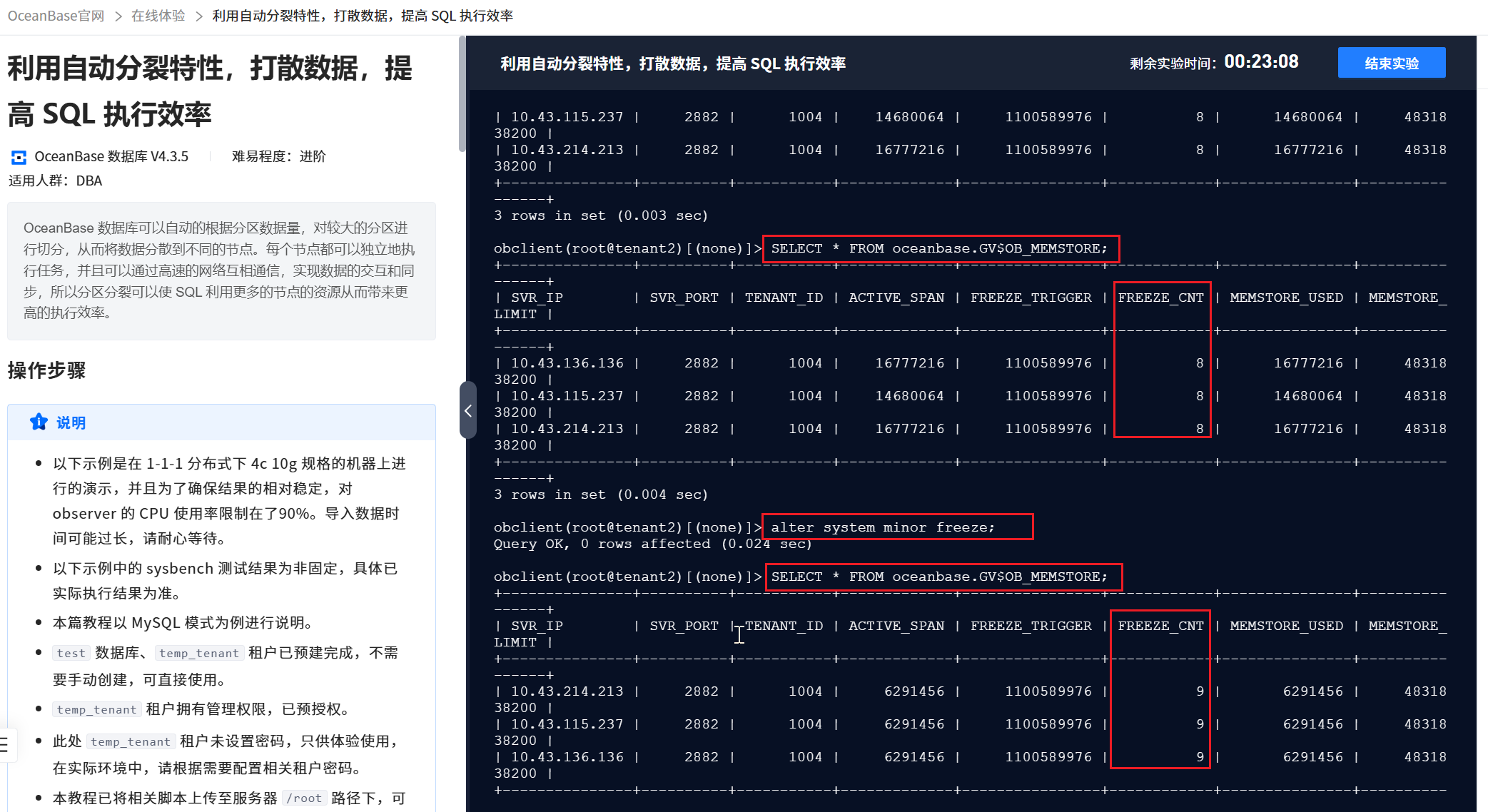 但是今天在官网的在线体验环境中测试的时候发现,手动执行以下转储命令后,freeze_cnt会发生变化。