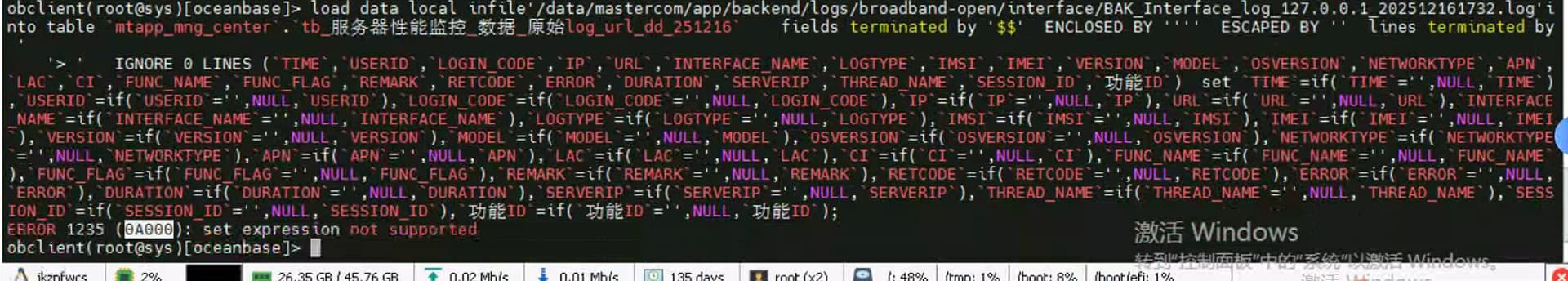 sql: load data local infile’/data/mastercom/app/backend/logs/broadband-open/interface/BAK_Interface_log_127.0.0.1_202512161732.log’into table mtapp_mng_center.tb_服务器性能监控_数据_原始log_url_dd_251216 fields terminated by ‘$$’ ENCLOSED BY ‘’’’ ESCAPED BY ‘’ lines terminated by ’
