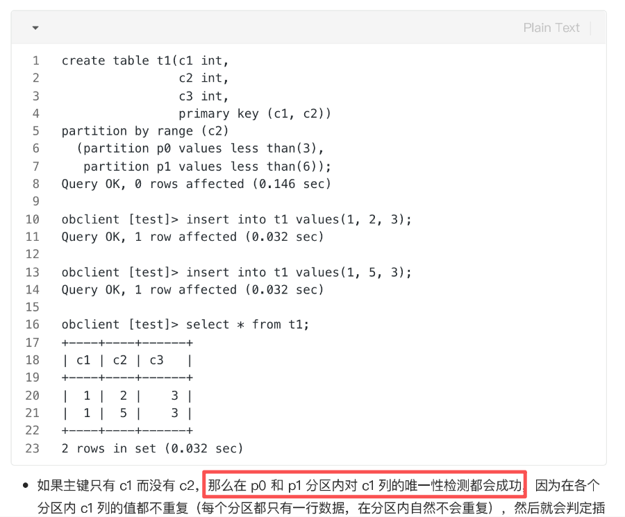 在官方的案例中,创建了一个分区表 t1,其中 c1 和 c2 组成主键,而 c2 是分区键。这是因为分区键 c2 确定了数据的分布,而主键 c1 和 c2 的组合确保了每一行数据的唯一性。即使 c1 可以重复,但 c1 和 c2 的组合仍然保证了唯一性。