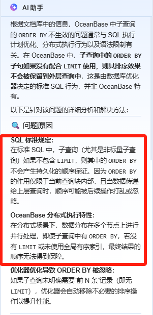 是不是下面这个原因,因为是ob集群分布式环境,导致子查询的结果到上层查询后排序就不可预估了?