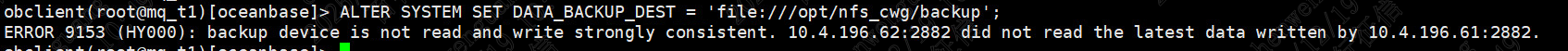 针对您在 OceanBase 测试环境中配置 DATA_BACKUP_DEST 时遇到的错误 9153,表示备份目录无法读写强一致的问题,虽然 NFS 配置检查无误并且各服务器可以正常读写,但仍然存在这个问题,可能涉及到更深层次的文件系统权限、NFS 挂载选项或 OceanBase 对备份路径的具体要求。我们可以先使用 obdiag 工具来收集与备份有关的日志信息,这将有助于我们进一步分析问题的原因。