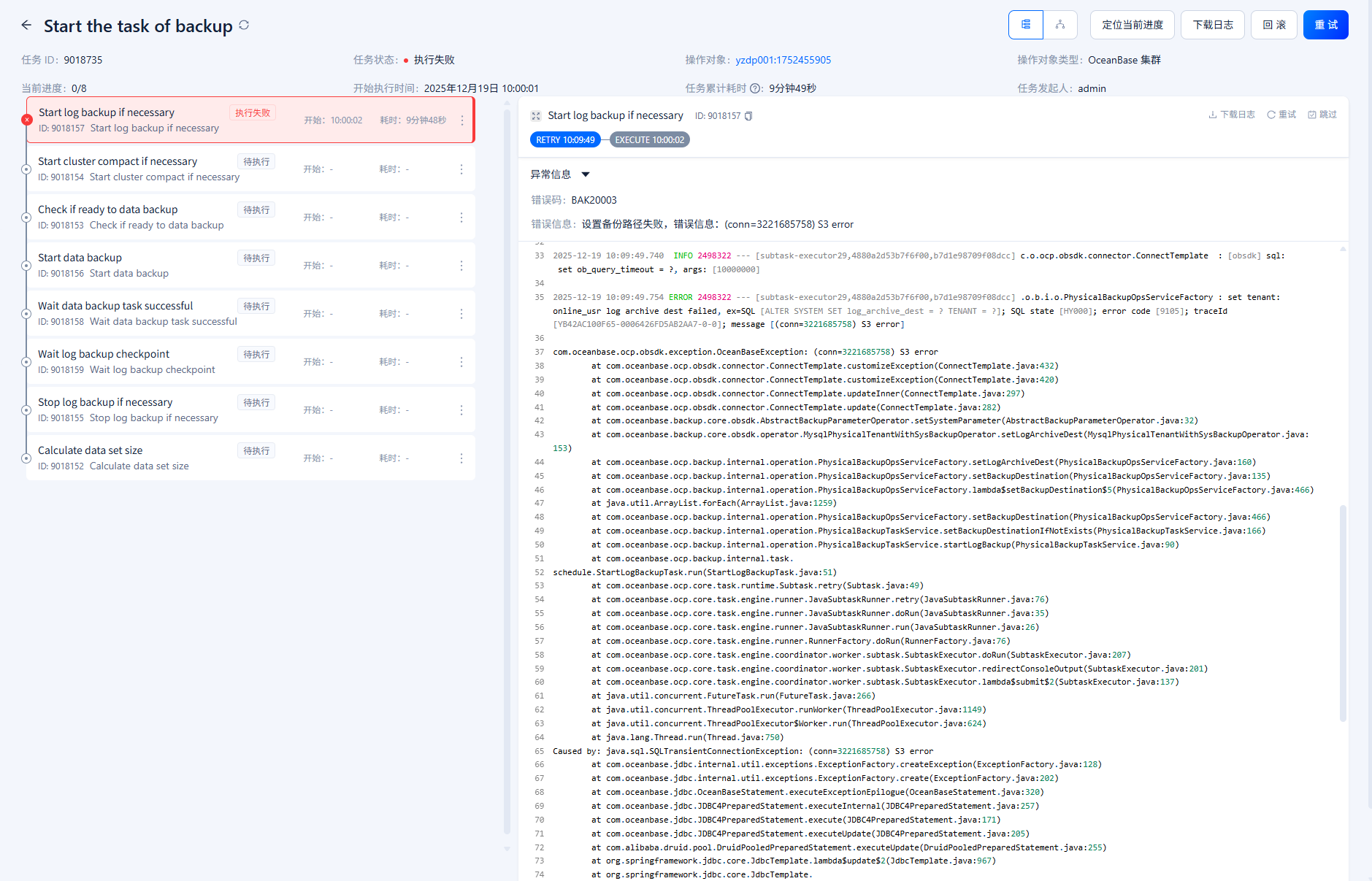 2025-12-19 10:09:49.286 INFO 2498322 — [subtask-executor29,4880a2d53b7f6f00,b7d1e98709f08dcc] c.o.o.c.t.e.runner.JavaSubtaskRunner : Retry subtask, id=9018157, context=Context{parallelIdx=-1, stringMap={checkBeforeDataBackup=true, scheduleTime=10:00:00, ob_version=4.2.1.8, startClusterCompact=false, task_instance_id=9018735, task_operation=retry, ob_cluster_id=1752455905, startLogBackup=true, backupDim=CLUSTER, cluster_id=2, tenantName=*, backupMode=physical, scheduleDayMode={“1”:“FULL_BACKUP”,“2”:“FULL_BACKUP”,“3”:“FULL_BACKUP”,“4”:“FULL_BACKUP”,“5”:“FULL_BACKUP”,“6”:“FULL_BACKUP”,“7”:“FULL_BACKUP”}, scheduleMode=week, triggerType=SCHEDULED, latest_execution_start_time=2025-12-19T10:09:49.202+08:00, sub_task_instance_name=Start log backup if necessary, sub_task_instance_id=9018157, obClusterName=yzdp001}, listMap={}}, executor=172.16.15.104