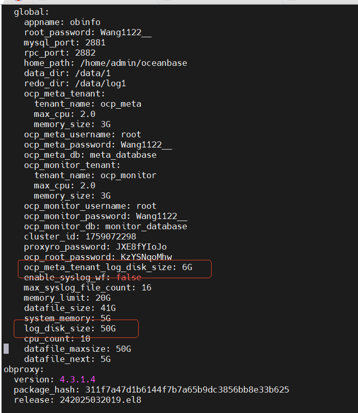 需要修改ocp_metadata与cop_monitor 日志磁盘空间,使用obd cluster edit-config xxxx(集群名)修改