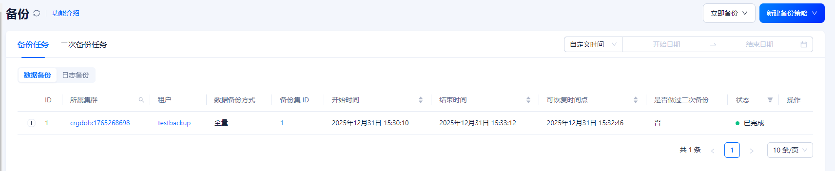 我重新创建了个租户测试了下,黑屏执行后,ocp能看到备份发起了,数据显示备份成功了,然后日志好像卡着很久没完成,这个实时的进度好像看不了,不知道具体卡在哪了
