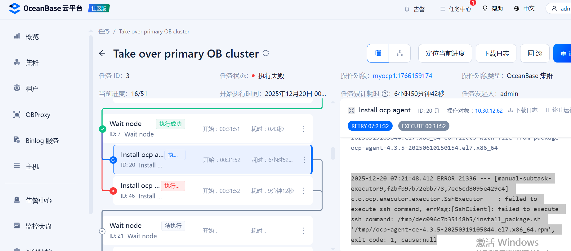 2025-12-20 07:21:48.412 ERROR 21336 — [manual-subtask-executor9,f2bfb97b72ebb773,7ec6cd8095e429c4] c.o.ocp.executor.executor.SshExecutor : failed to execute ssh command, errMsg:[SshClient]: failed to execute ssh command: /tmp/dec096c7b35148b5/install_package.sh ‘/tmp//ocp-agent-ce-4.3.5-20250319105844.el7.x86_64.rpm’, exit code: 1, cause:null