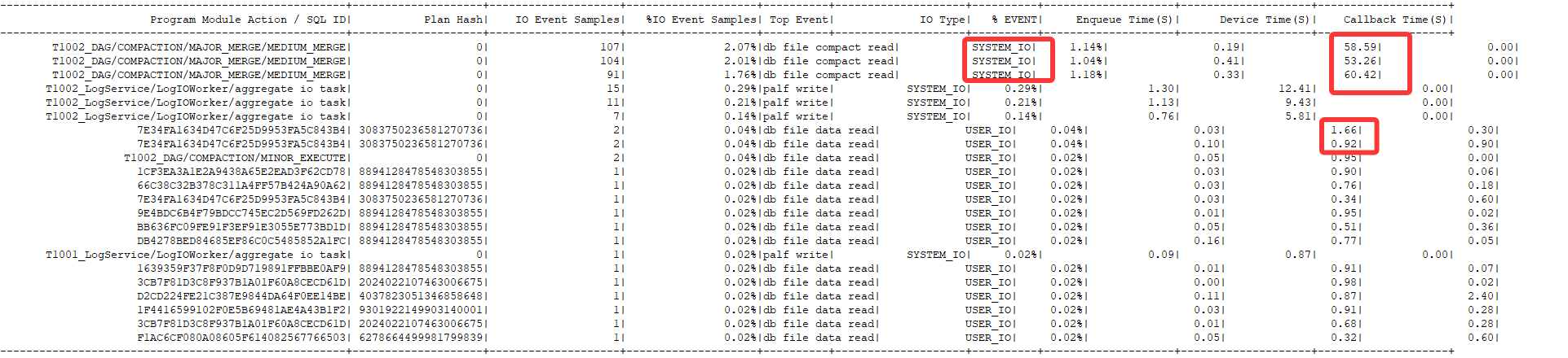 通过obdiag采集了当时的集群ash,发现当时有很多合并,不清楚是不是合并导致的,但是合并设置的时间是夜里2点开始,15分钟就合并完毕了,观察MEMStore使用百分比在14:16:30秒大量的下降,是不是和转储有关呢?如果是转储导致触发的原因,这个是否有历史事件记录,在哪里可以查到每一次转储发生的时间呢?