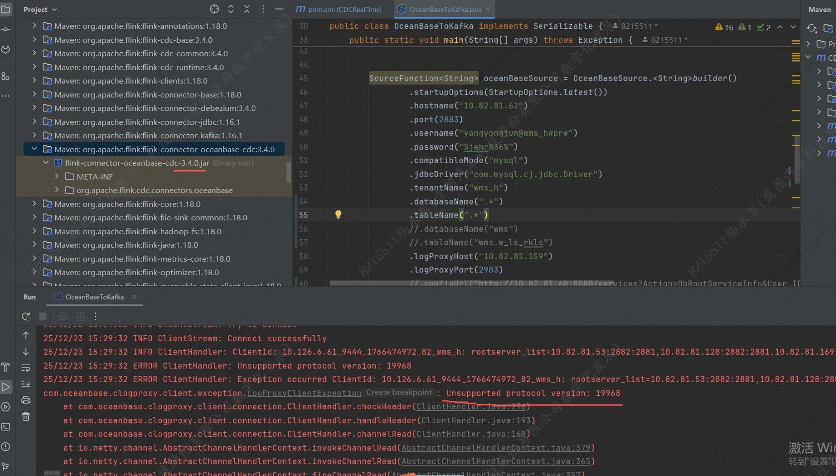 【问题描述】业务采用flink cdc去抽取OB数据库的binlog日志程序报错(报错请看附件),flink cdc 版本是3.1.1,采用的方案为该文档: https://nightlies.apache.org/flink/flink-cdc-docs-release-3.1/docs/connectors/flink-sources/oceanbase-cdc/#setup-oceanbase-and-logproxy-server