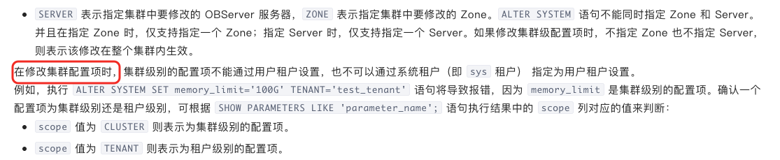 在修改集群配置项时,集群级别的配置项不能通过用户租户设置,也不可以通过系统租户(即