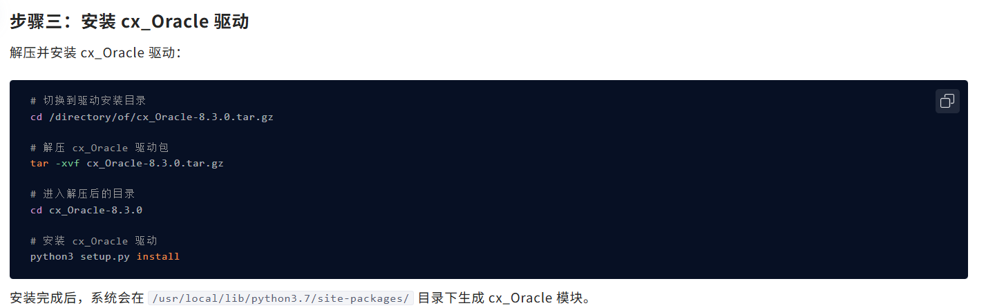 官方文档要求 cx_Oracle 驱动,但是这个cx_Oracle-8.3.0.tar.gz我没找到下载的地方。PIP install CX-Oracle下载的 好像用不了 ,或者我可能配置错了 。有没有大佬用python连过OB oracle的