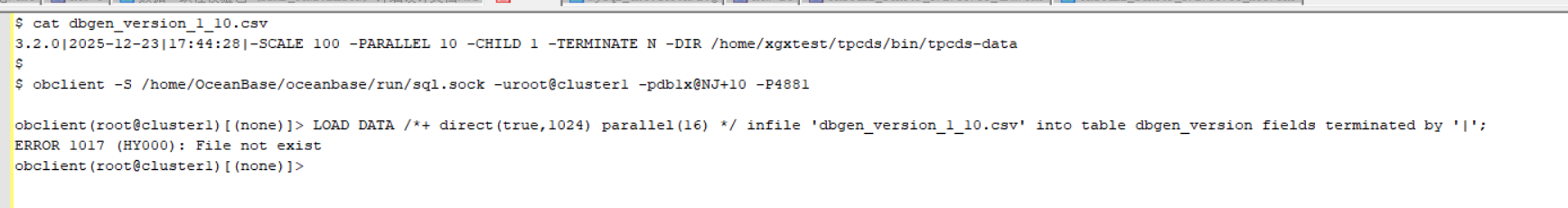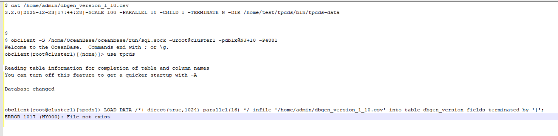 obclient(root@cluster1)[(none)]> LOAD DATA /*+ direct(true,1024) parallel(16) */ infile ‘/home/admin/dbgen_version_1_10.dat’ into table dbgen_version fields terminated by ‘|’;