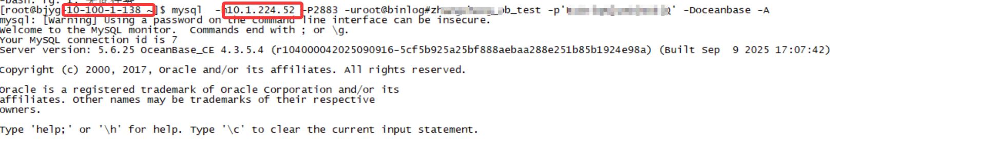 [root@ob ~]# obclient -h192.168.207.18 -P2881 -uroot@sys -p'xxx.' -Doceanbase -A