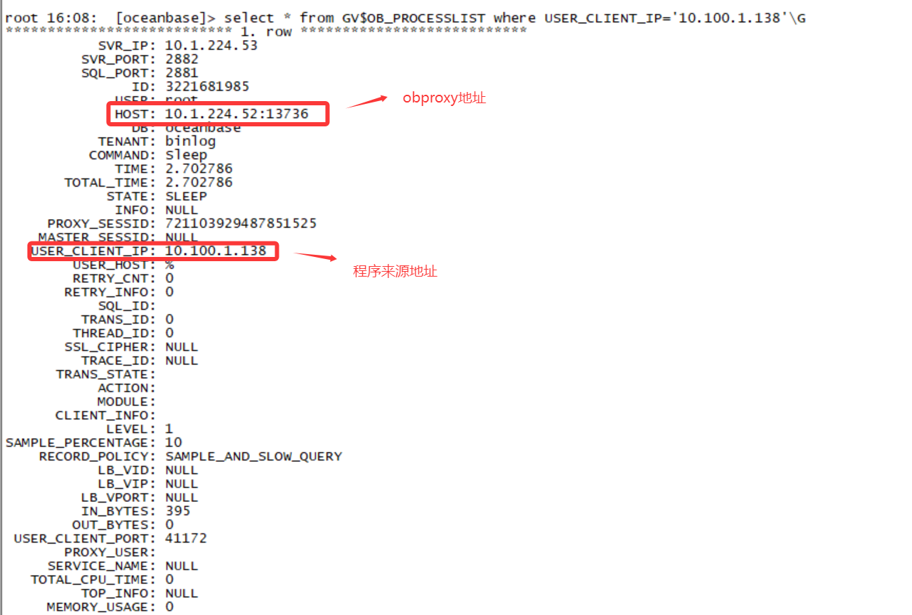 如题,我想要查看普通租户的连接信息,可以做到吗,在 select zone,svr_ip,inner_port,svr_port from __all_server; 这个SQL查询到的 IP 和 端口 等能直连上这个租户吗?如果是 obproxy 连接的话能否通过SYS租户查询到 obproxy 这个端口呢?