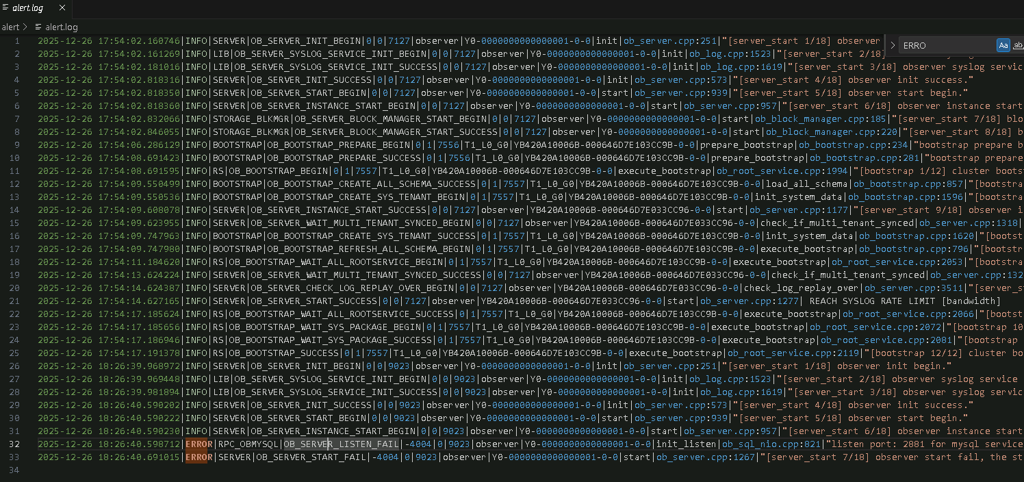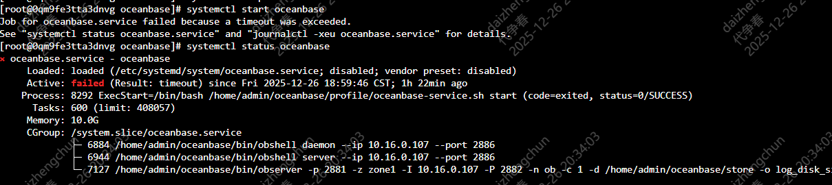 【问题描述】root使用rpm安装部署后systemctl start oceanbase 超时错误