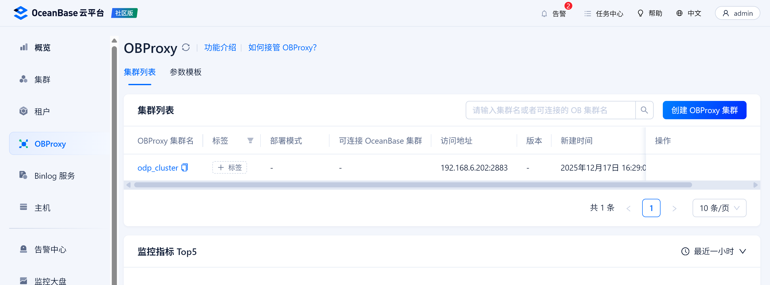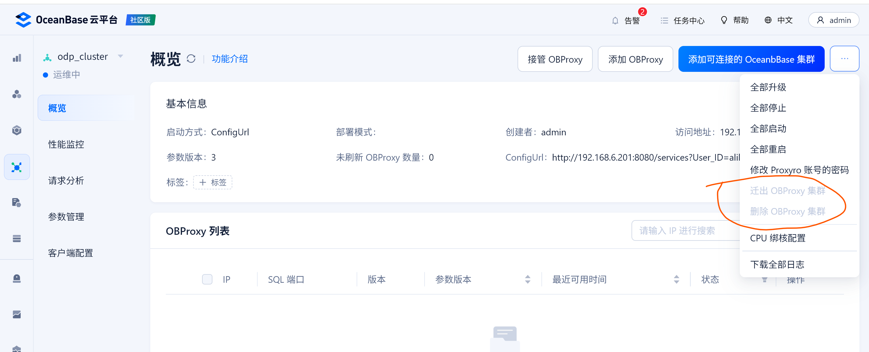 通过OCP创建的obproxy集群,因测试需要直接在obproxy所在主机清理了相关进程及文件.目前OCP运维界面显示依旧存在obproxy集群,因为已经清理了obproxy的进程及与其相关所有目录,不能执行迁出选项,此种情况下如何在OCP中删除obproxy集群信息?是否可以在OCP的数据库中直接清理相关信息?
