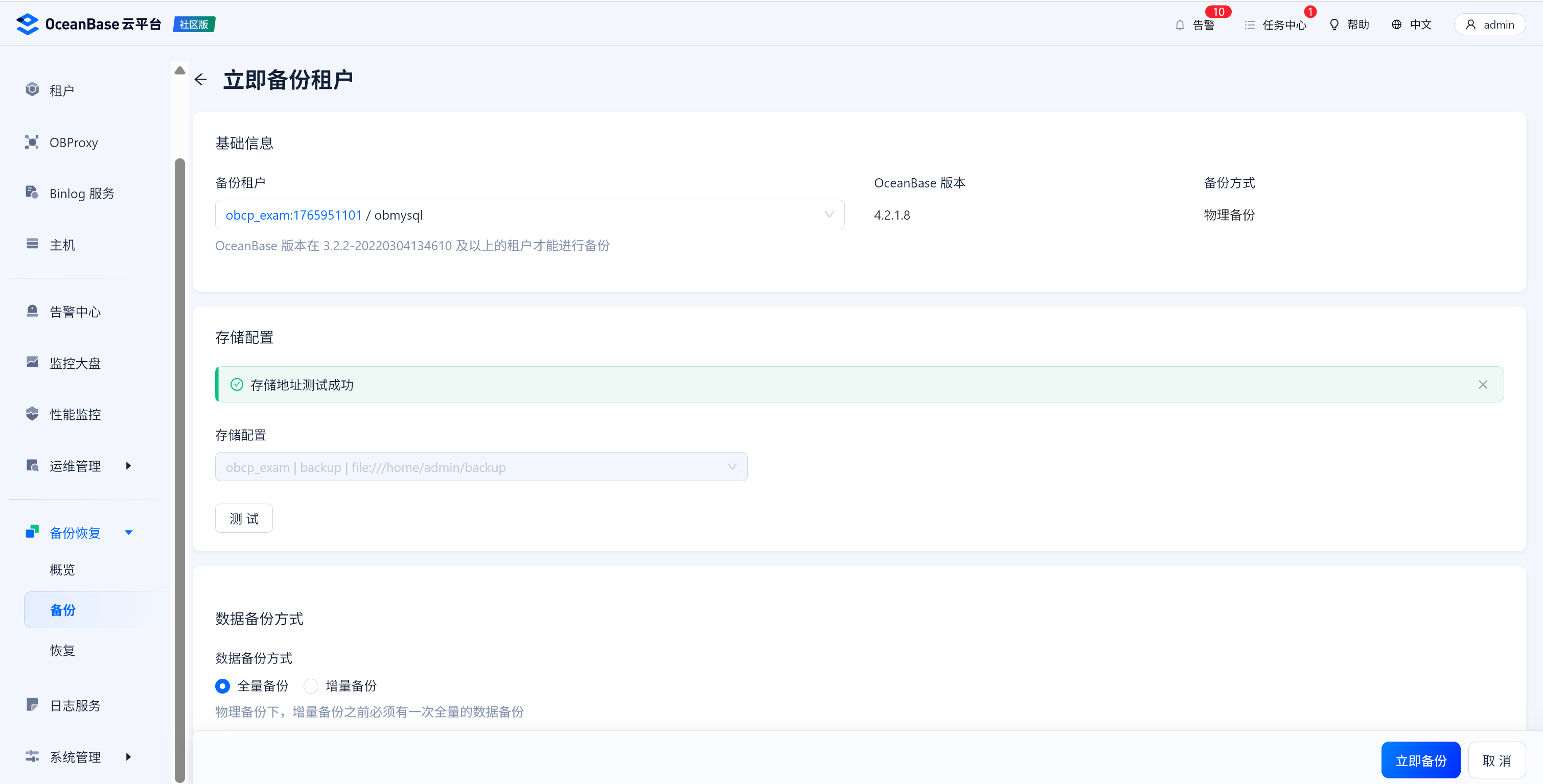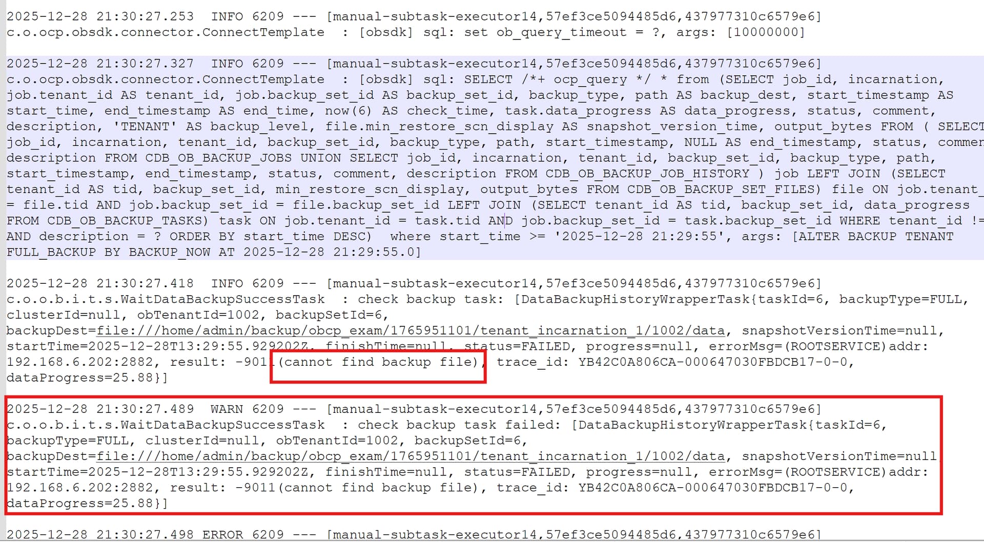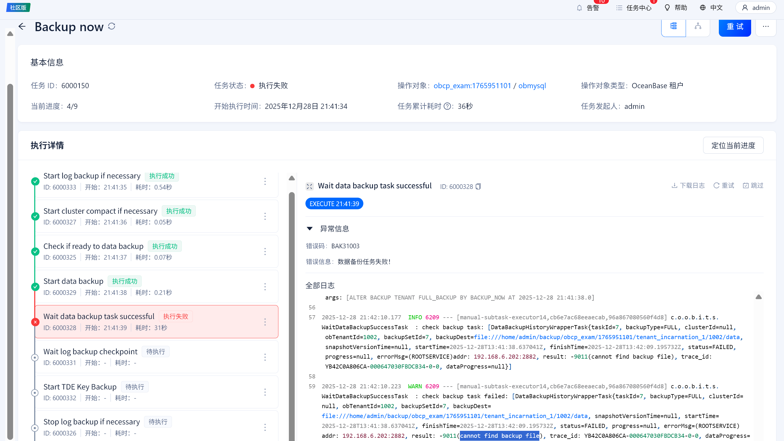 1-1-1集群,OCP已配置备份策略,备份路径为observer本地地址,OCP白屏界面发起租户全量备份失败,提示cannot find backup file,何种原因?是因为OCP不认可observer本地路径而必须是NFS路径配置么?