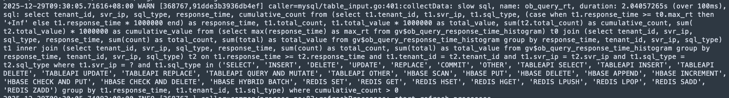 2025-12-29T11:26:27.61063+08:00 WARN [337983,606e7e9ccc907c2b] caller=mysql/table_input.go:401:collectData: slow sql, name: ob_system_event, duration: 15.54191752s (over 100ms), sql: select /* MONITOR_AGENT */ con_id tenant_id, wait_class as event_group, sum(total_waits) as total_waits, sum(time_waited_micro / 1000000) as time_waited from v$system_event where v$system_event.wait_class <> 'IDLE' and (con_id > 1000 or con_id = 1) group by tenant_id, event_group