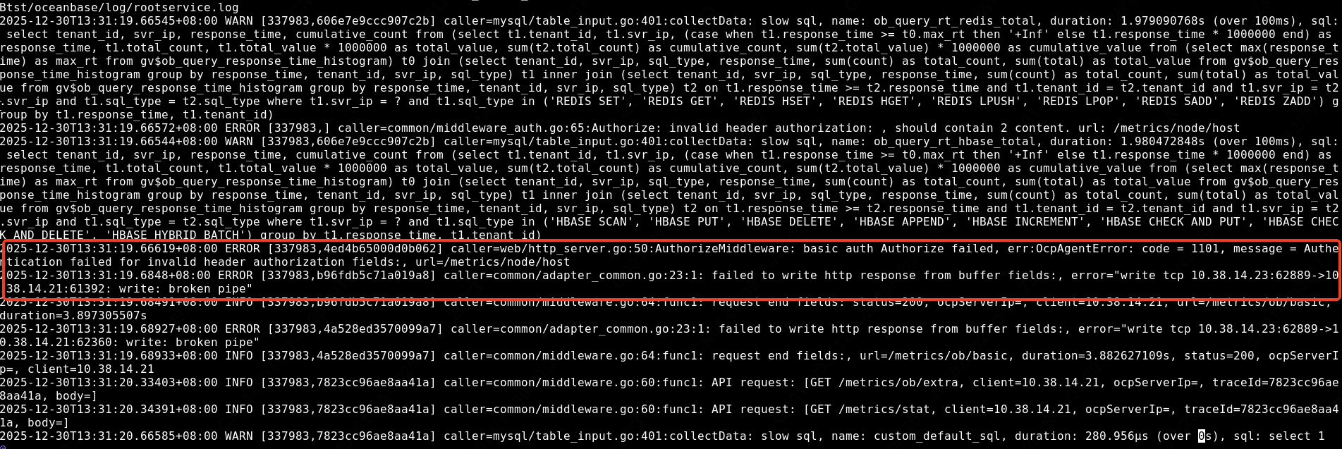 2025-12-29T11:26:25.66688+08:00 ERROR [337983,c174ba90b3791d4e] caller=web/http_server.go:50:AuthorizeMiddleware: basic auth Authorize failed, err:OcpAgentError: code = 1101, message = Authentication failed for invalid header authorization fields:, url=/metrics/obproxy