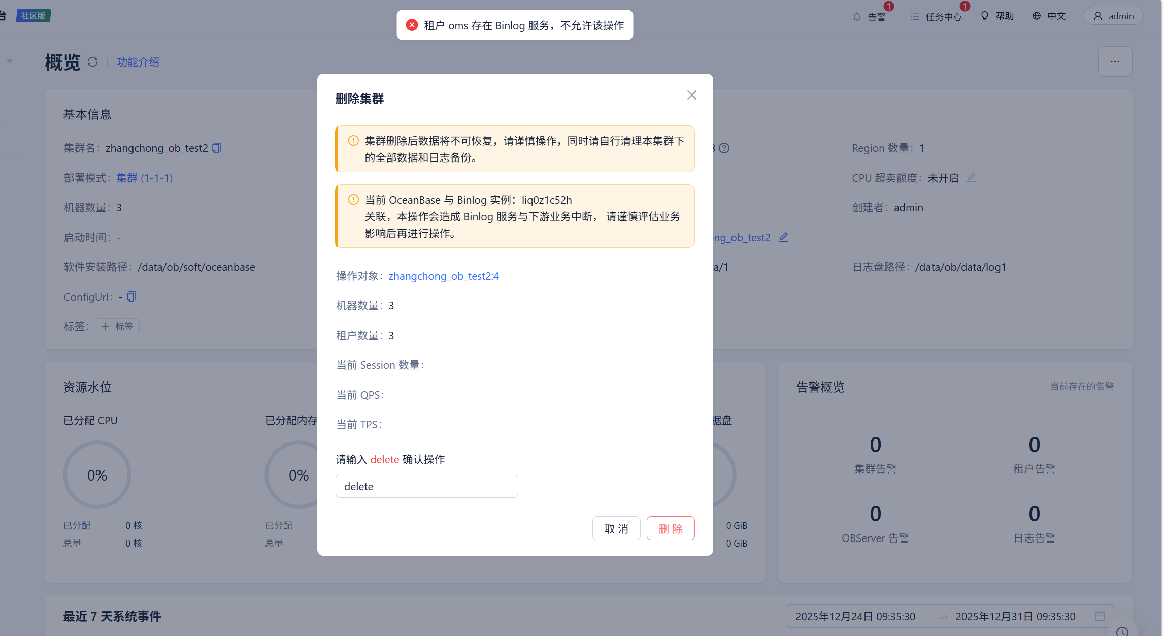 想删除集群报 [租户 oms 存在 Binlog 服务,不允许该操作]