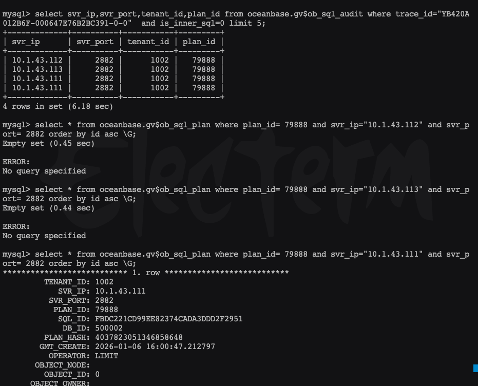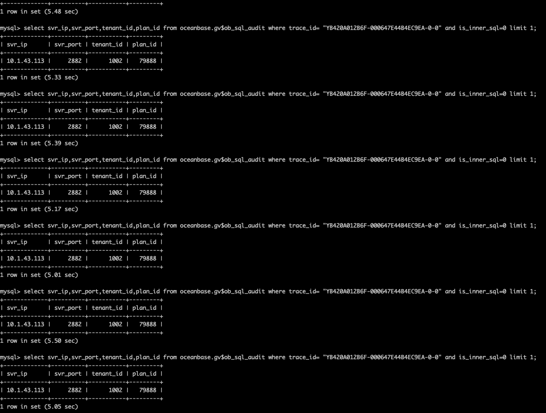 select svr_ip,svr_port,tenant_id,plan_id from oceanbase.gv$ob_sql_audit where trace_id= ? and is_inner_sql=0 limit 1;
