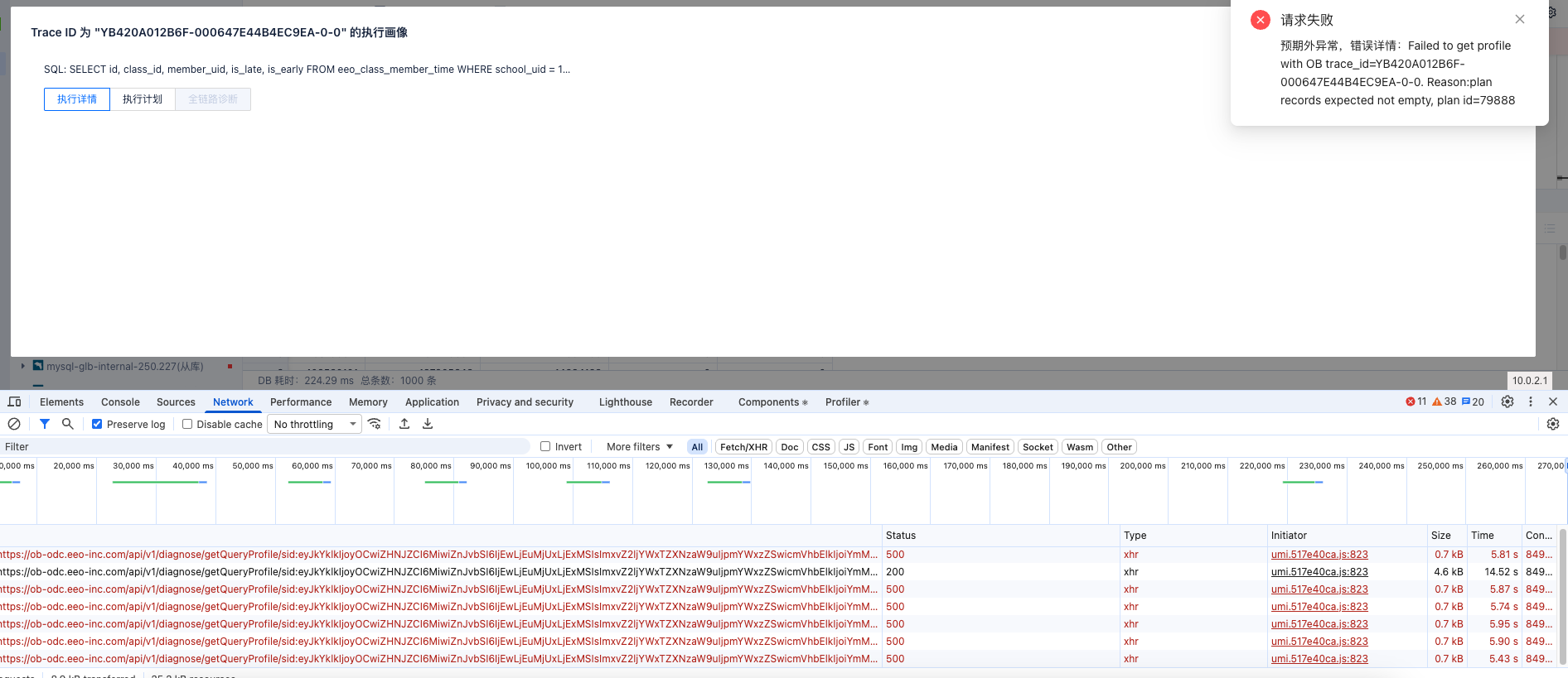多次执行都没问题,大概都是3秒出结果,但是执行画像,一会好一会不好,我f12看了下结果是报500了,logr日志报Failed to get profile with OB trace_id=YB420A012B71-0006478D75DF6B5E-0-0.但是为啥会失败呢?