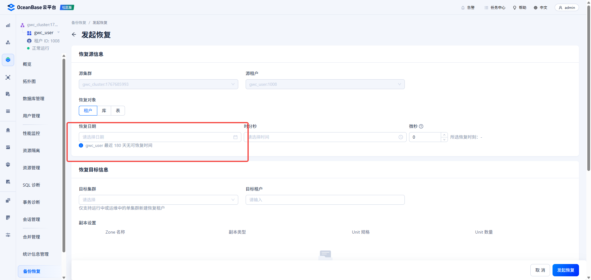 【问题描述】租户备份后无法进行恢复,页面显示180天内没有可以恢复的时间点