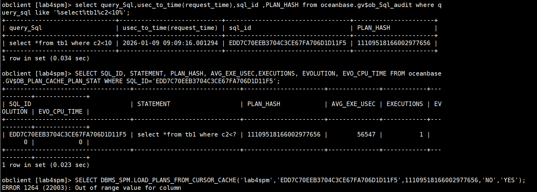 【问题描述】执行DBMS_SPM.LOAD_PLANS_FROM_CURSOR_CACHE报Out of range value for column是为什么啊?我参照博客里面的帖子 是一样的 但是我这个执行不了