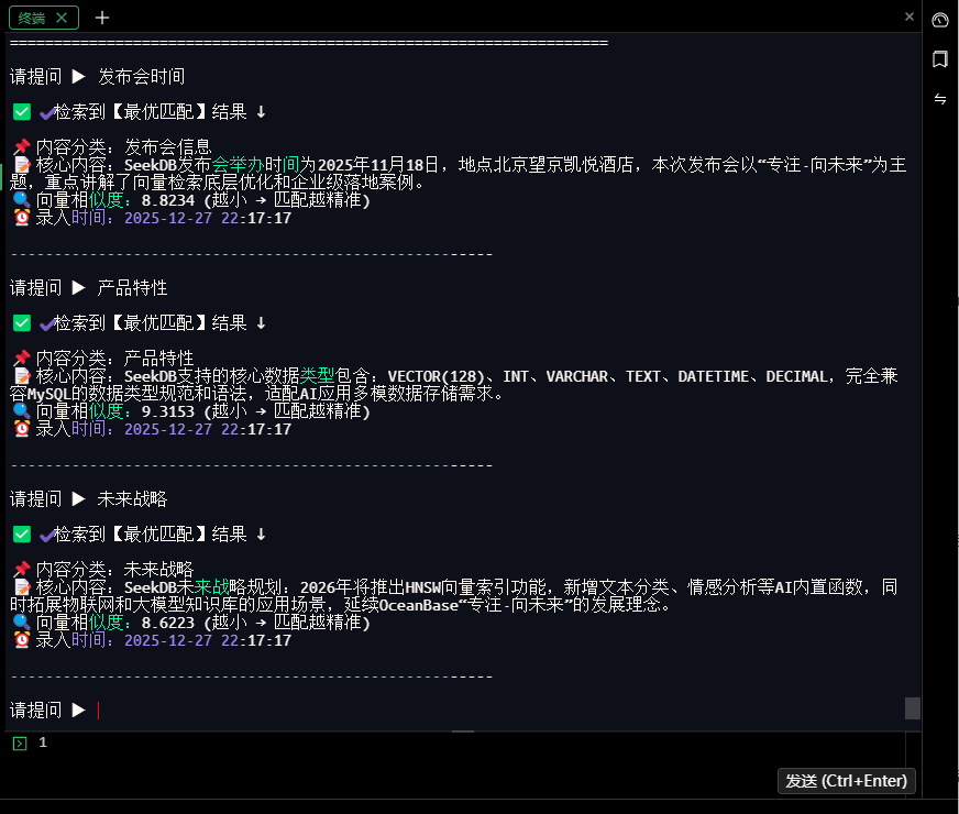 输入查询内容(如“seekdb 特性”“未来战略”),输入 q 退出