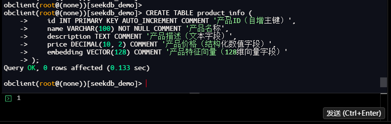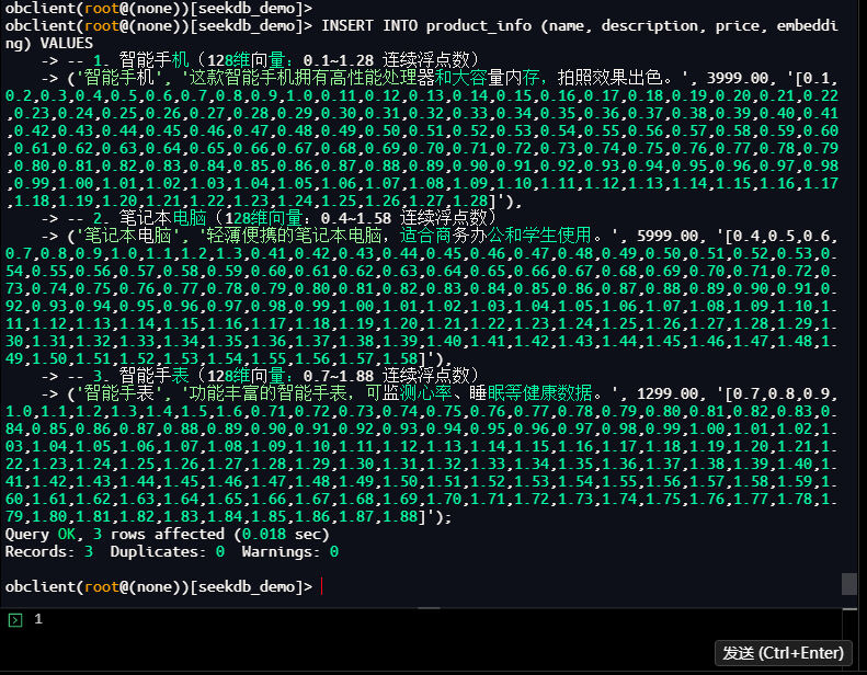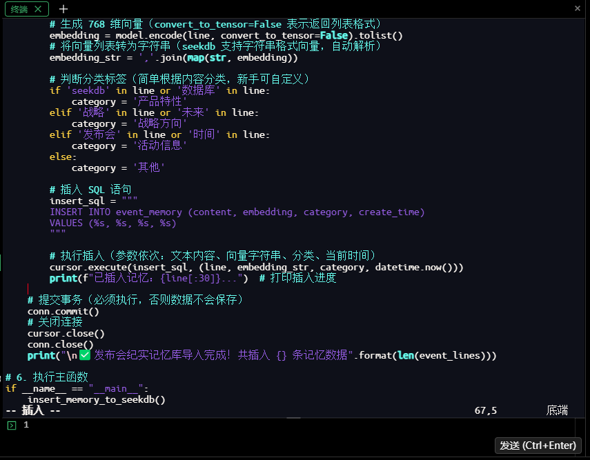 成功提示:✅ 数据插入成功!共5条SeekDB发布会知识库数据