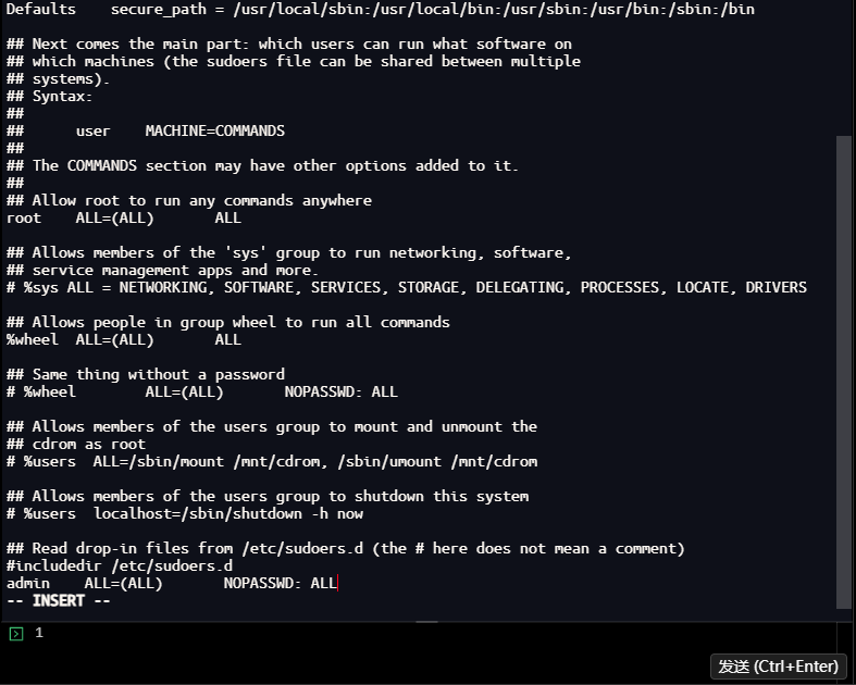 # 在文件末尾添加:admin ALL=(ALL) NOPASSWD: ALL