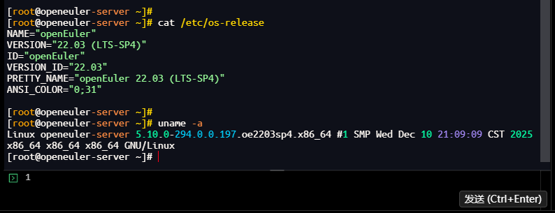 Linux openeuler-server 5.10.0-294.0.0.197.oe2203sp4.x86_64 #1 SMP Wed Dec 10 21:09:09 CST 2025 x86_64 x86_64 x86_64 GNU/Linux