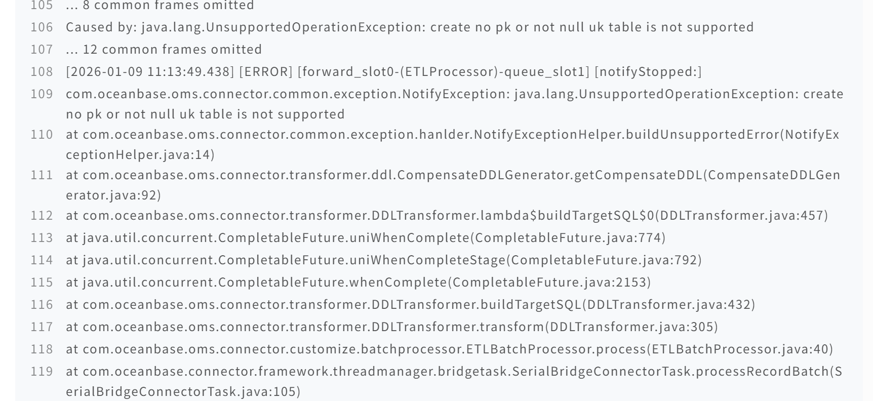 事情是这样的,用oms做mysql和oceanbase双活,双向同步数据,mysql是源端,oceanbase是目标端,本来同步正常,突然源端插入了一个没有主键和没有唯一索引的表,这个同步就报如下错误