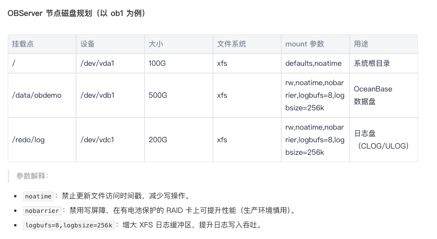 如下文档里只有ext4配置,超过16T需要使用xfs配置,且参数 nodelalloc、 barrier=0 不同版本xfs存在兼容性问题
