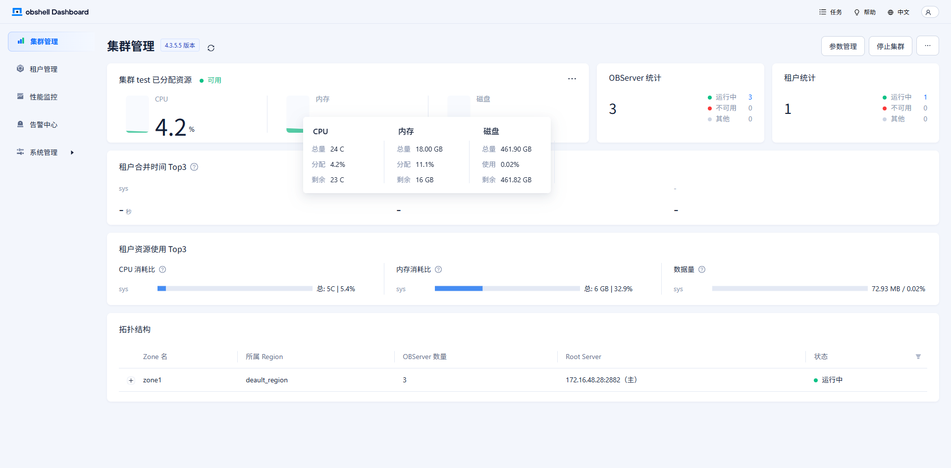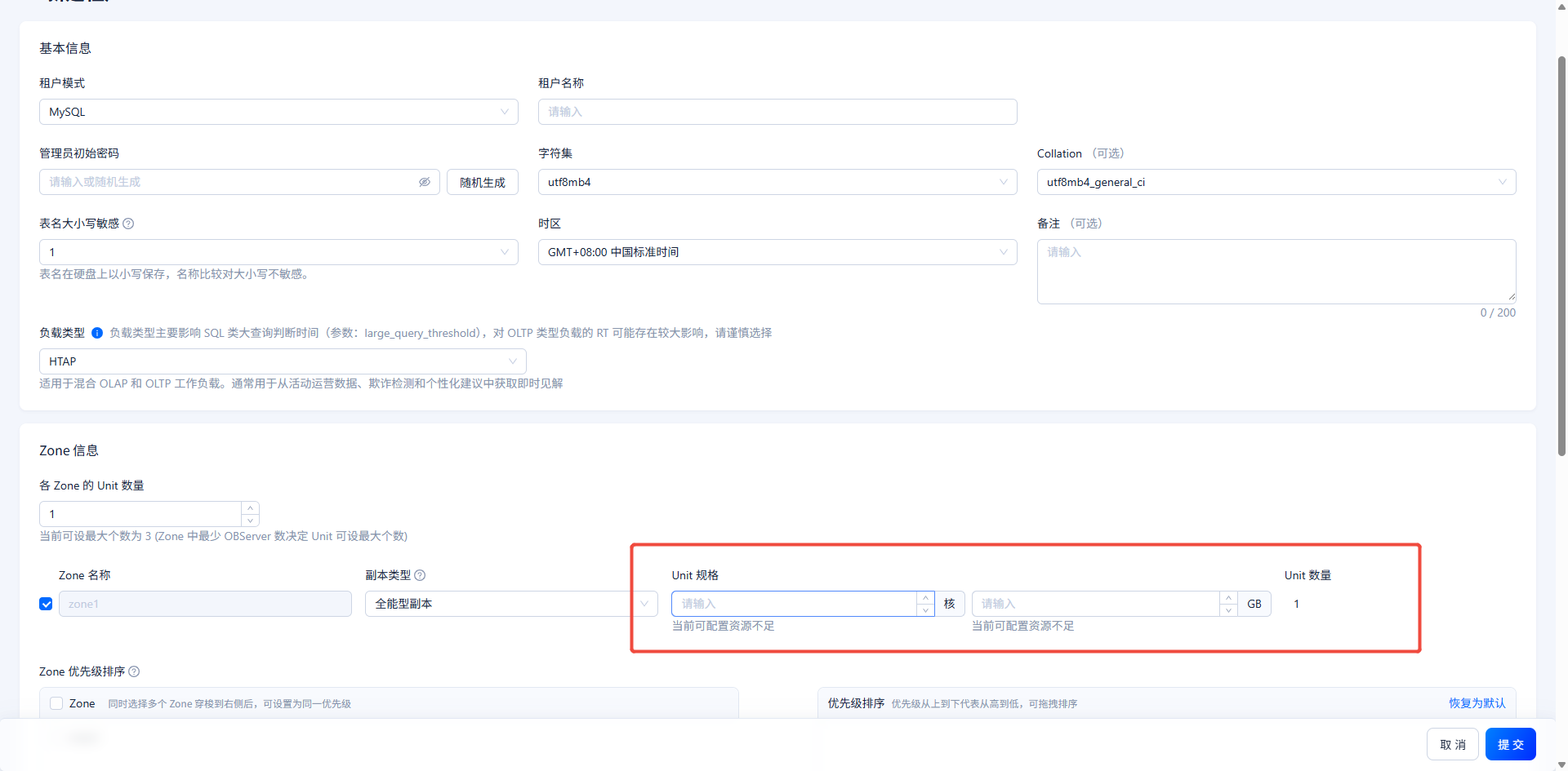 【问题描述】3个OB SERVER, memory_limit 设置8G ,system_memory 设置2G,集群资源显示充足,新建租户提示资源规格不足。