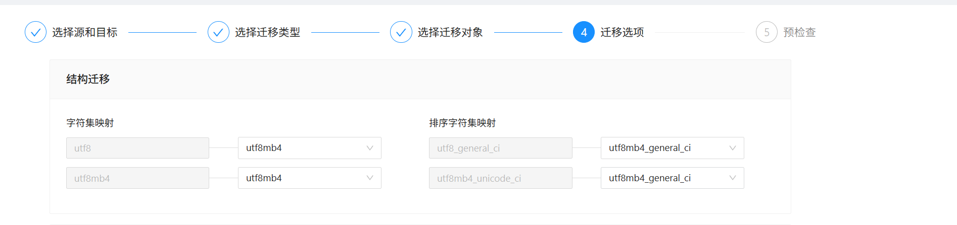 【问题描述】OMS字符集映射疑似未生效,已经设置了utf8_general_ci——>utf8mb4_general_ci,但是结构迁移仍报错-- [WARNING] The table collation: “utf8mb4_unicode_ci” is unsupported in OBMYSQL_CE_4.2(4.2.1.10). Object: cp_three_payment_product