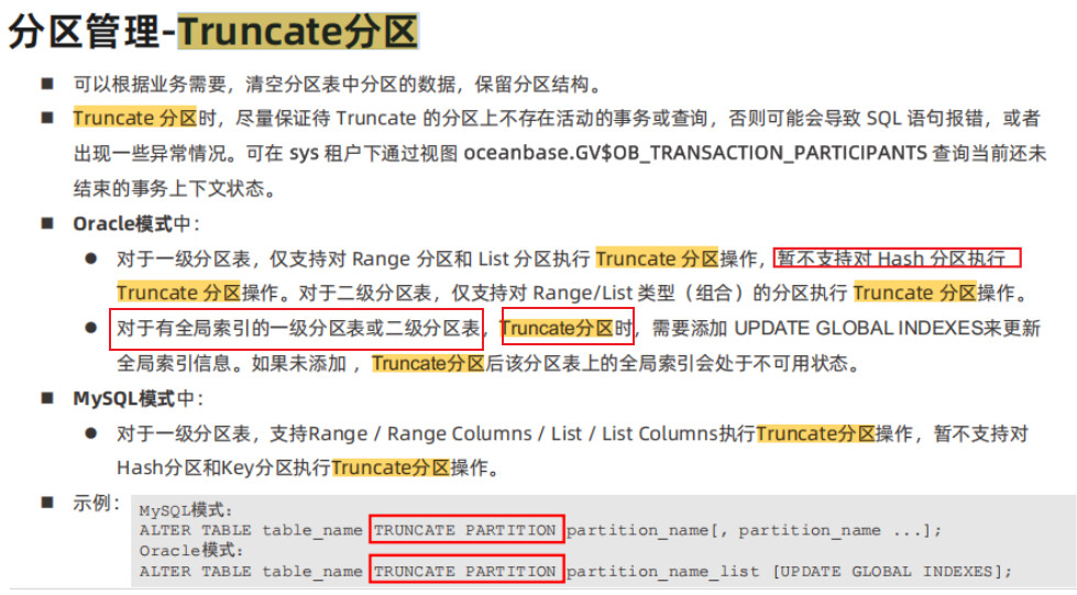 在Oracle模式下关于TRUNCATE分区,以下说法正确的是: