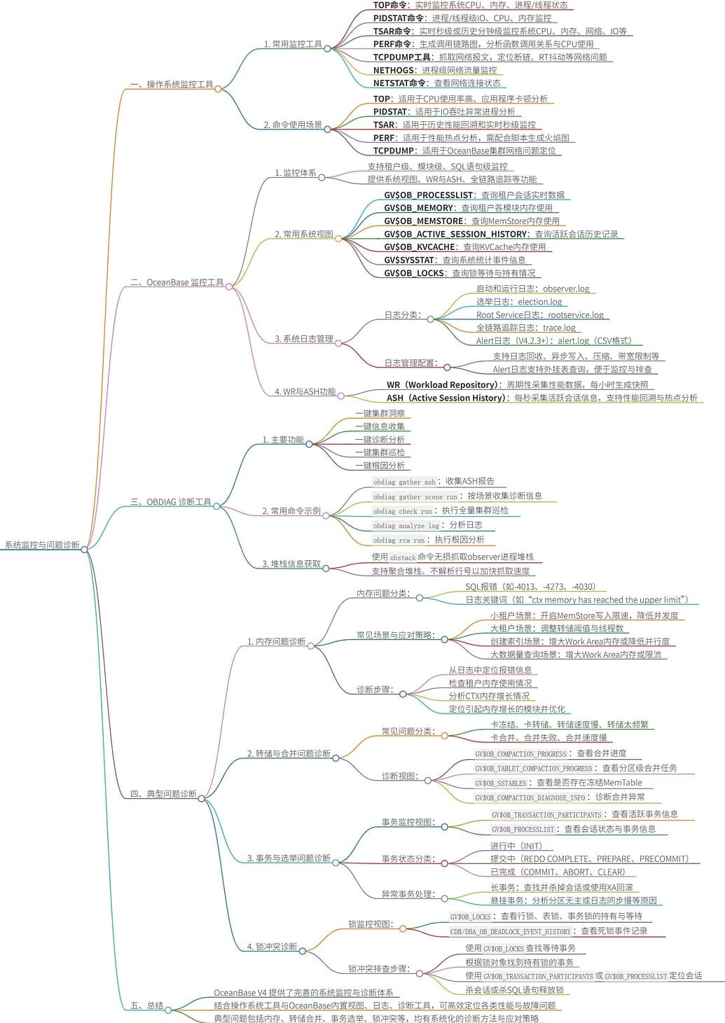 top、tsar、pidstat、perf、tcpdump)与OceanBase内置监控视图(如GV$OB_PROCESSLIST、GV$OB_MEMORY),实现从硬件到数据库的全链路监控。