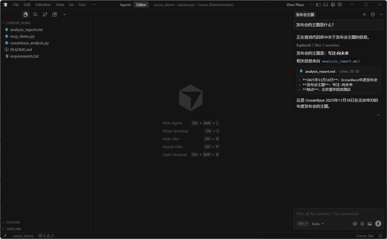 作为OceanBase布道师计划核心实践方向,本次基于发布会核心内容与技术体系,深度落地 Cursor Agent + OceanBase MCP + SeekDB 技术组合,完整诠释当下最火的Vibe编码范式——开发者无需编写复杂SQL、无需熟记数据库语法,仅通过自然语言描述业务需求,即可让AI完成「需求解析→SQL生成→数据库操作→结果返回」的全闭环流程。