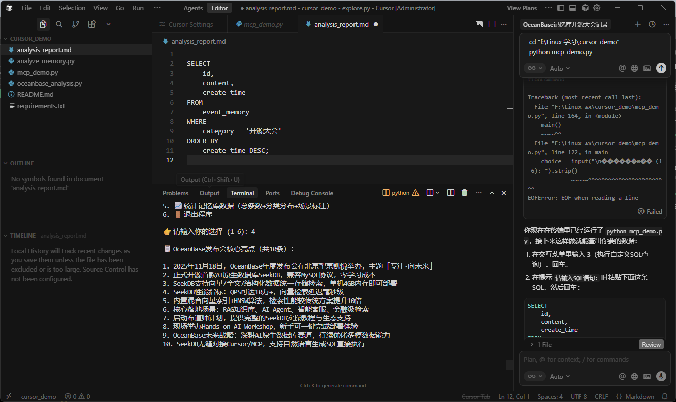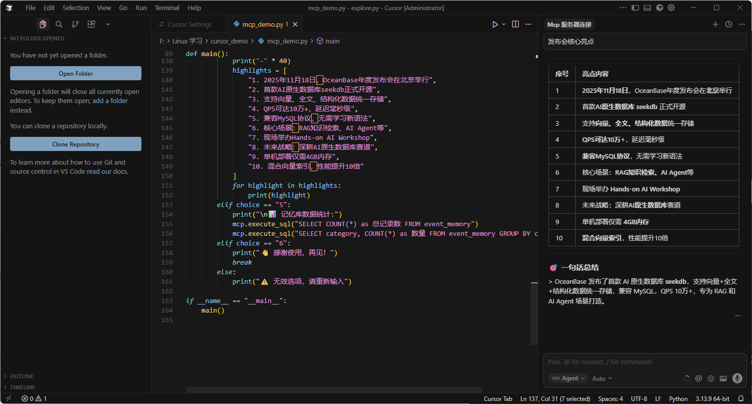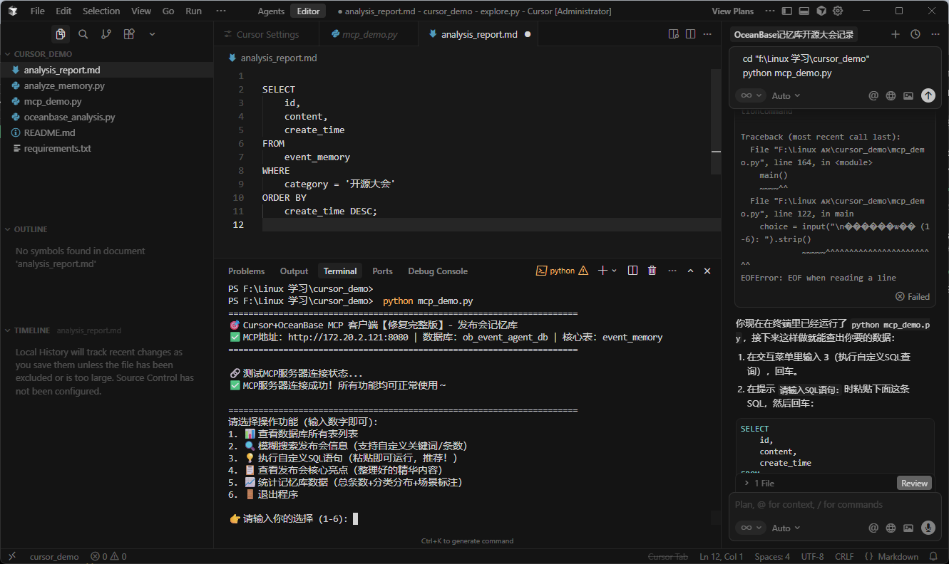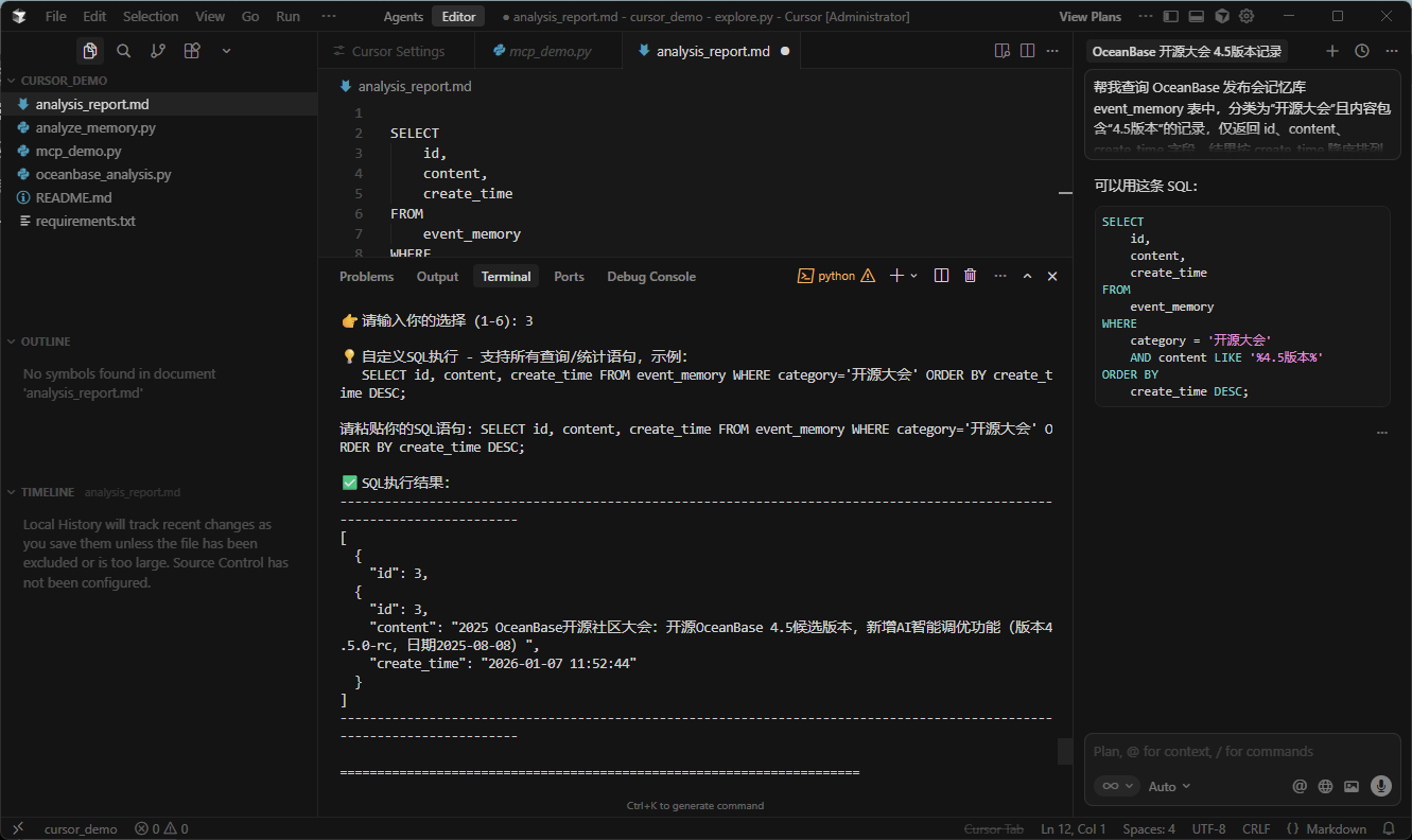 🎯 Cursor+OceanBase MCP 客户端【修复完整版】- 发布会记忆库