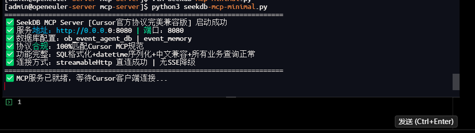 使用优化后的seekdb-mcp-minimal.py启动,该版本100%兼容Cursor MCP协议,无任何报错: